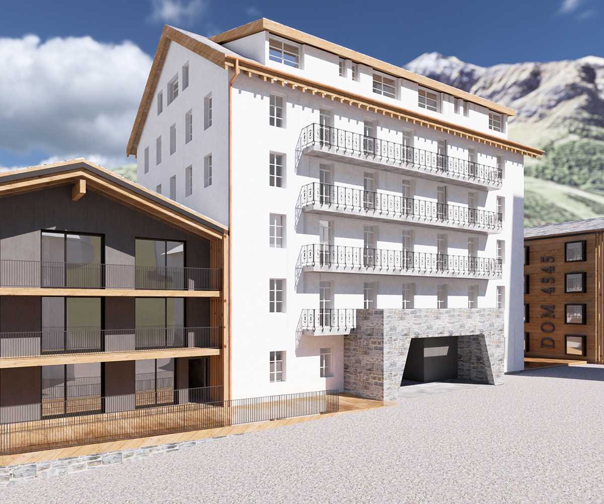 Das Dom 4545 entsteht als Erweiterung des traditionsreichen Dom-Hotels und vereint alpinen Lifestyle mit moderner Investitionsmöglichkeit. In mehreren Bauphasen entstehen drei neue Gebäude mit insgesamt 67 hochwertigen Hotelstudios und Hotelsuiten, jede mit Panoramablick auf die imposante Bergwelt von Saas-Fee.